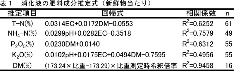 - 消化液は原料のスラリーよりも、メタン発酵によって、pHが高く、乾物が少なく、アンモニウム態窒素が多くなる。消化液の肥料成分含量はpH、EC、乾物含量(%)等によって推定できる(表1)。
