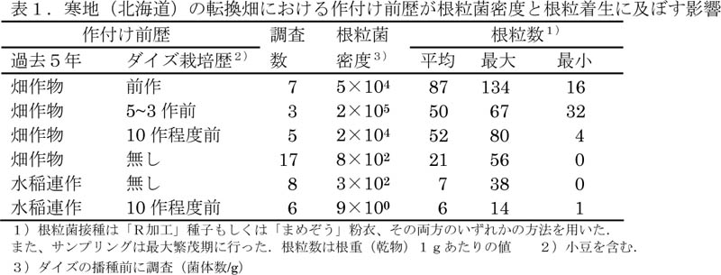 - 寒地転換畑のダイズ初作圃場では根粒菌密度が低く、根粒着生が不良である。転換後にダイズの栽培歴があればその後10作程度ダイズ以外の畑作物を栽培しても前作ダイズ跡と同等の菌密度(おおよそ104〜105菌体数/g乾土)となる(表1)。