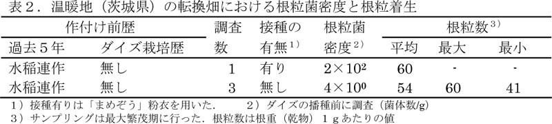 - 温暖地では根粒菌密度が低下した水稲連作跡でも根粒着生が認められるが、寒地では根粒菌密度が低下した水稲連作跡では根粒着生が不良である(表1、表2)。