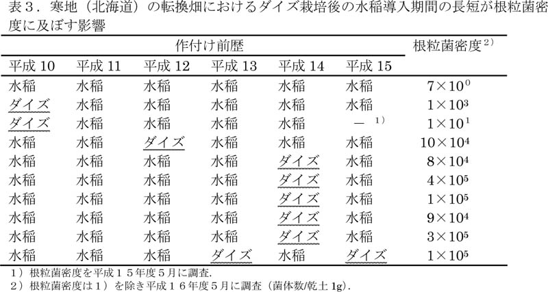 - 寒地転換畑におけるダイズ栽培後の水稲栽導入間が1作ならば前作ダイズ跡と同等の根粒菌密度(おおよそ104〜105菌体数/g乾土)である。長期の水稲連作跡では根粒菌密度は低下する(表3)。