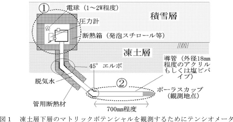 - 既存のテンシオメータの地上部と凍土層部分を断熱材で覆い、さらに小さな熱源(1〜2W程度)を入れることでテンシオメータ内の水の凍結を防止できる。これにより、積雪・土壌凍結期間でも凍土層下の非凍土壌のマトリックポテンシャルが連続かつ長期的に精度良く計測できる(図1)。