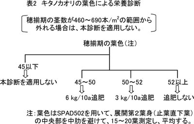 - 以上より、穂揃期に展開第2葉の葉色を測定し、葉色値が52以上の時はそれ以上の追肥は行わない。一方、葉色値が50〜52の時は穂揃期に3kg/10a、50未満の時は6kg/10a程度の追肥を行う。本診断を適用する範囲として、穂揃期の茎数が460〜690本/m2(収穫期穂数440〜640本/m2)の範囲で、さらに穂揃期の葉色45以上の場合とする(表2)。