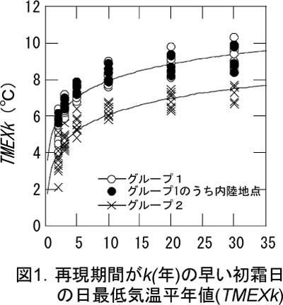 (2)再現期間がk年の早い初霜日と、その日の日最低気温平年値(T(−)min)の関係を調べると、図1が得られる。