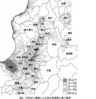 北海道の任意地点において、任意の日以前に初霜日に達する確率を推定できる。発育モデルを組み合わせると、任意の日に播種した大豆等作物が初霜害に遭う確率を推定できる。さらにメッシュ気象情報を併用すると、初霜害リスクマップが作成できる。