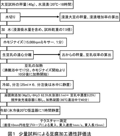 - 少量(40g)子実による豆乳および充填豆腐調製工程を検討した結果、豆乳調製時の総加水量を試料乾重比7.5倍、豆乳加熱時間17分、0.25%MgCl2による凝固等の諸条件を設定した(図1)。