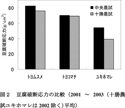 - 少量の大豆原料による豆腐調製および豆腐破断応力の測定が可能であり、豆腐の硬さを選抜形質とした系統選抜、および、小規模の栽培法試験における処理区別の豆腐加工適性の判定に活用できる。
