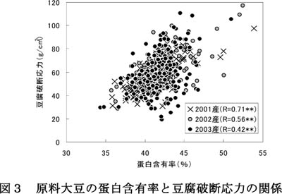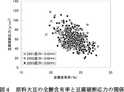 - 道内品種の豆腐の硬さを比較すると、主要品種では「トヨムスメ」が最も硬く、「ユキホマレ」が最も柔らかい傾向が見られた(図2)。また、蛋白(図3)および全糖含有率(図4)と豆腐の硬さとの間には有意な相関が認められたものの、いずれも単独の分析値から豆腐の硬さを推定するのは困難と考えられ、実測による評価が不可欠である。