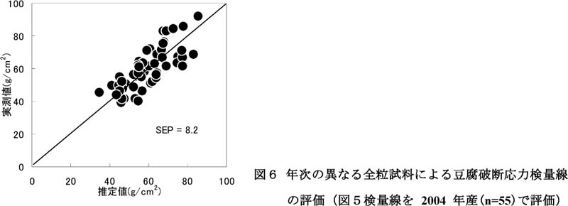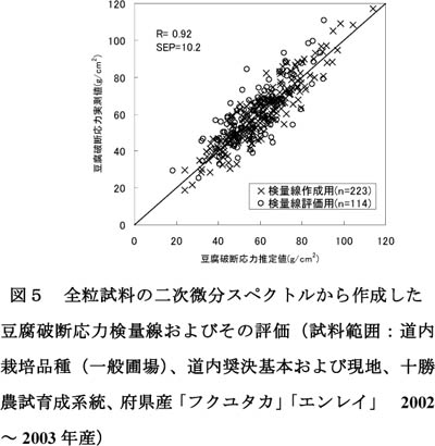 - 大豆全粒による豆腐破断応力の非破壊評価法として近赤外分光法を検討した結果、二次微分スペクトルからPLSR法によって得た検量線が高い精度を示し(図4)、異なる年次の試料にも良く適合した(図5)。