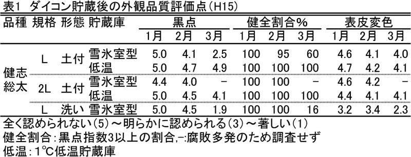 - ダイコン貯蔵において、2月までは黒点の発生が少なく、健全割合も高く、外観品質が良く維持されたことから、雪氷室型貯蔵庫で2月まで貯蔵可能である。洗いダイコンを用いた場合、2月までは土付よりも黒点の発生が少ないが、腐敗、表皮変色の発生が多くなる。サイズはL,2Lいずれを用いても貯蔵性に与える影響は小さい(表1)。