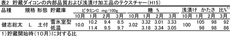 - 2月までの貯蔵たいこんの内部品質やかたさなどの物理性は、ほとんど変化せず(表2)、加工実需者評価も高い。