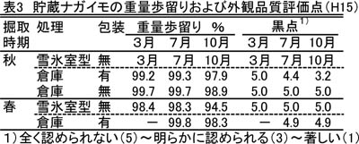 - ナガイモ貯蔵において、秋掘り品は3月以降、黒点状の腐敗が多く発生する。しかし、春掘り品は入庫後、腐敗がほとんど見られないことから、秋掘り品を3月まで出荷し、その後春掘り品を入庫、出荷することにより、周年供給が可能である(表3)。内部品質に関して、秋掘り品を雪氷室型貯蔵庫で貯蔵すると糖が高まる。