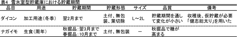 - 以上をまとめて雪氷室型貯蔵庫におけるダイコン、ナガイモの貯蔵期間とした(表4)。