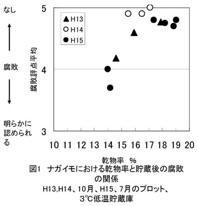 - ナガイモの乾物率が15%以下になると、貯蔵中の腐敗が多く発生する(図1)。