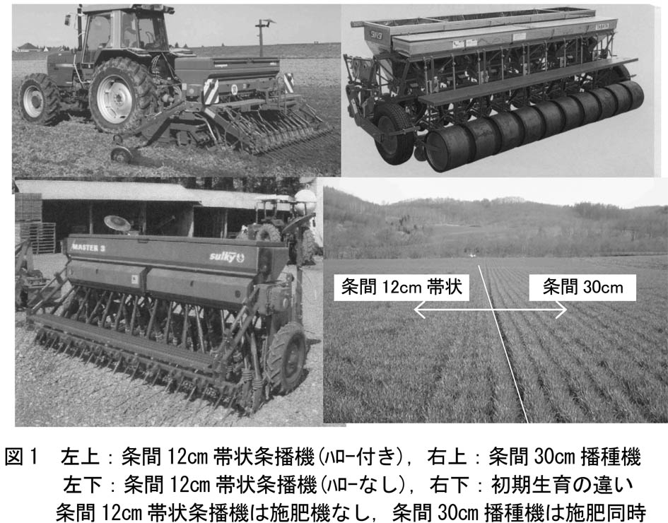 - 供試機は条間12cm帯状条播機(ハローつき、ハローなし)と対照の条間30cm条播機である。12cm帯状条播機は施肥装置を持たず、ブロードキャスタによる別作業となる。ハローつきではプラウの代わりにチゼルプラウを用いて砕土同時播種を行う。条間30cm条播機は施肥同時作業である(図1)。