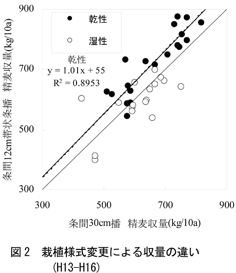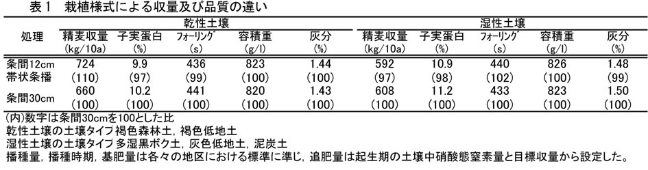 - 十勝地域の異なる土壌タイプの複数圃場において、平成13播種年度から平成16播種年度にかけて実施した同一圃場内の比較によれば、乾性土壌(褐色森林土11圃場、褐色低地土1圃場)において、条間12cm帯状条播による精麦収量は、対照の30cm条播よりも約10%多く、湿性土壌(多湿黒ボク土6圃場、泥炭土2圃場、灰色低地土2圃場)においては対照区よりも低収となる事例が多い。また、子実蛋白含量、フォーリングナンバー、灰分、容積重は対照区よりも劣ることはない(図2、表1)。