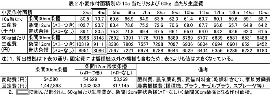 - 機械投資額は、条間30cm条播が約148万円、条間12cm帯状条播種機(ハローなし)が224万円、条間12 cm帯状条播種機(ハローつき)はチゼルプラウとあわせて357万円(うち、播種機294万円)である。10a当たり生産費は、作付面積が大きいほど低下するが、条間30cm条播<条間12cm帯状条播(ハローなし)<条間12cm帯状条播(ハローつき)の順は変わらない。60kg当たり生産費は作付面積が大きいほど低下し、条間12cm帯状条播(ハローなし)では4ha程度で条間30cm条播と同等になり、これ以上では低くなる。十勝地域の乾性土壌に立地する畑作経営では、秋まき小麦(ホクシン)の作付面積が4ha程度以上であれば、従来と同じ作付面積でもより生産費を低減できる(表2)。