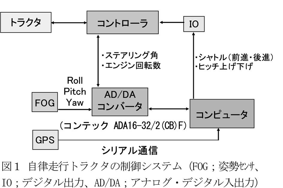 - トラクタのパワーステアリング、スロットル、前・後進・停止、作業機の上げ下げ、PTO入切がPCから制御でき(図1、2)、トラクタに搭載したGPSとジャイロ(FOG)により、圃場内の位置、方向、姿勢を認識して、往復直進作業、転回が自動でできる。