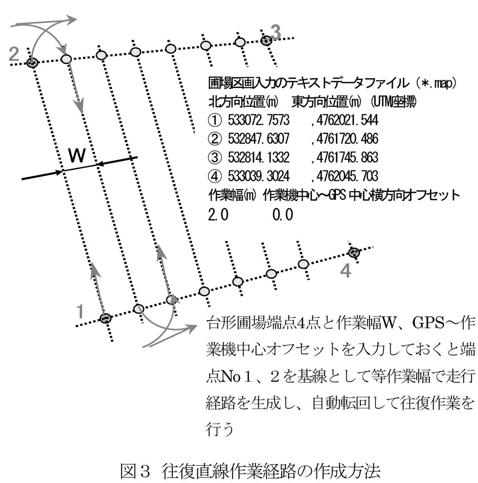 - 圃場の4隅の端点、作業幅、GPS〜作業機中心、最小旋回半径をあらかじめ作業ファイル、あるいはメニュから入力すると、図3のように端点No1、2を基線として等間隔の作業幅で走行経路を生成し、自動転回して往復作業を行うことができる。トラクタ単体での最小旋回半径は4.5mで、転回スペースは8m以上必要である。