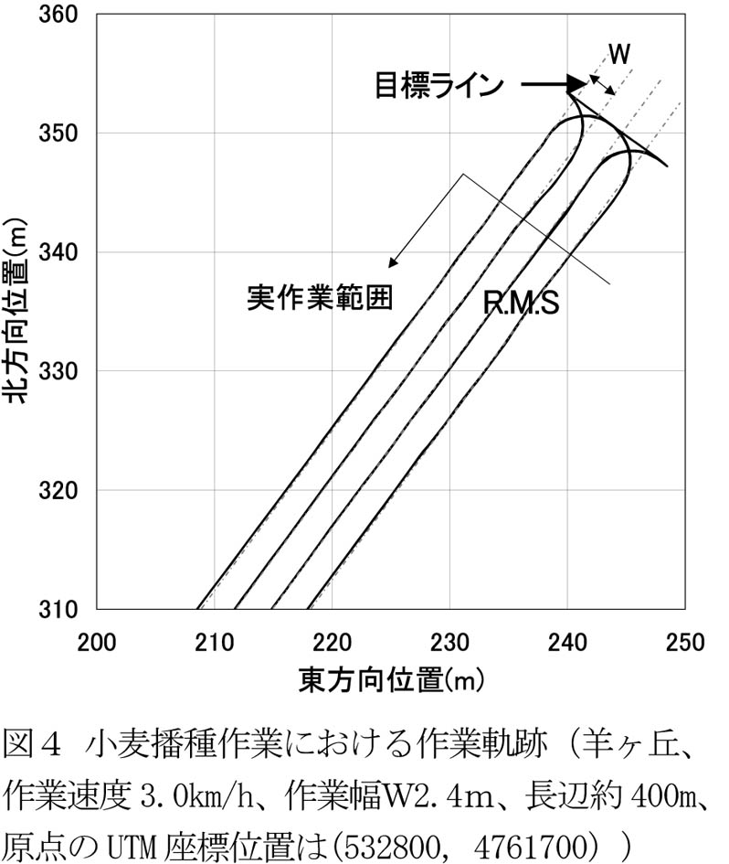 - RTK-GPSを搭載したときの作業精度は、横方向変異で最大10cm以内(R.M.Sでは5.2cm)である(図4)。走行速度は10km/hまで対応可能である。センサの信号取り込みと制御は10Hzで行っている。