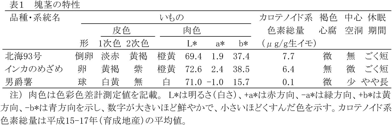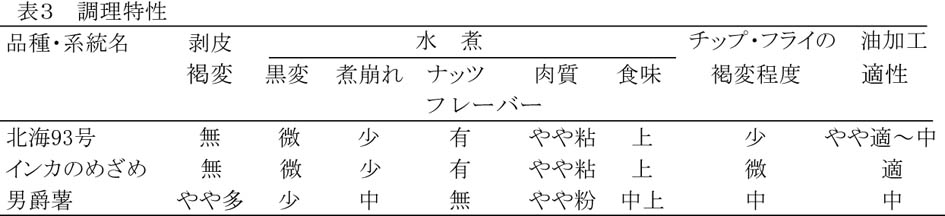 - 用途は調理用で、でん粉価は「インカのめざめ」より低く「男爵薯」並である(表2)。目が浅いため皮は剥きやすく、水煮での黒変や煮くずれは少ない。食味は上、油加工適性はやや適〜中である(表3)。褐色心腐の発生は微で、その他の生理障害はほとんどない(表1)。