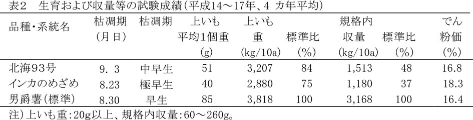 - 枯凋期は中早生で、「インカのめざめ」に比べて、いもの1個重がやや大きく、収量が多い(表2)。