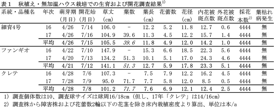 - 秋植え、無加温ハウス栽培での成績であり、抑制栽培および促成栽培での調査は行っていない。