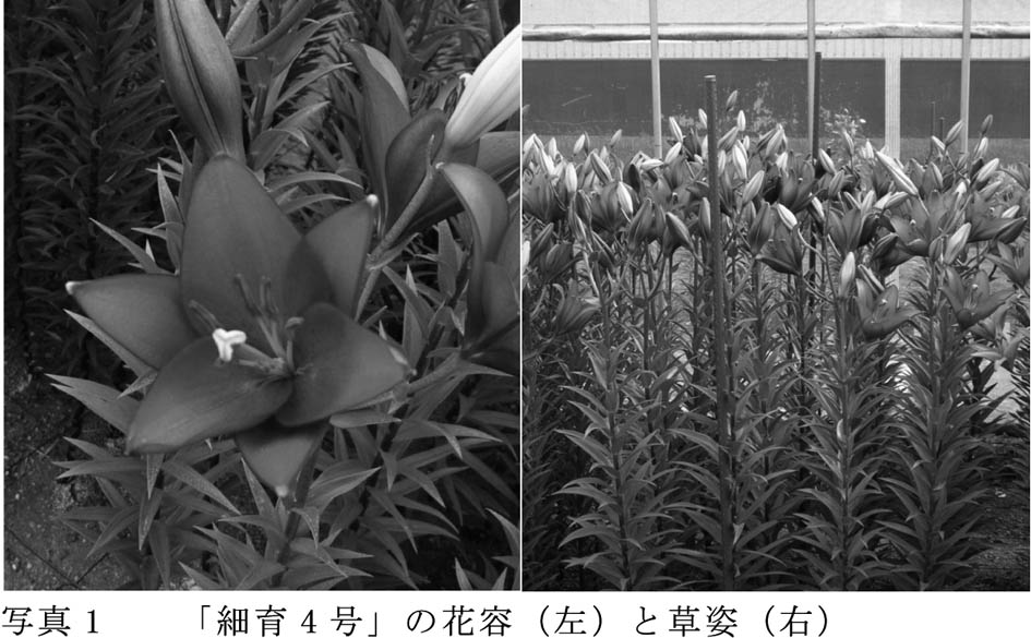 - 花ユリ「細育4号」は、中央農試保有個体94LA191-16(シンテッポウユリ品種「ホワイトランサー」×アジアティック系品種「クレテ」)を種子親に、「クレテ」を花粉親として交配し、胚珠-胚培養法により得られた雑種から選抜、育成した品種である。