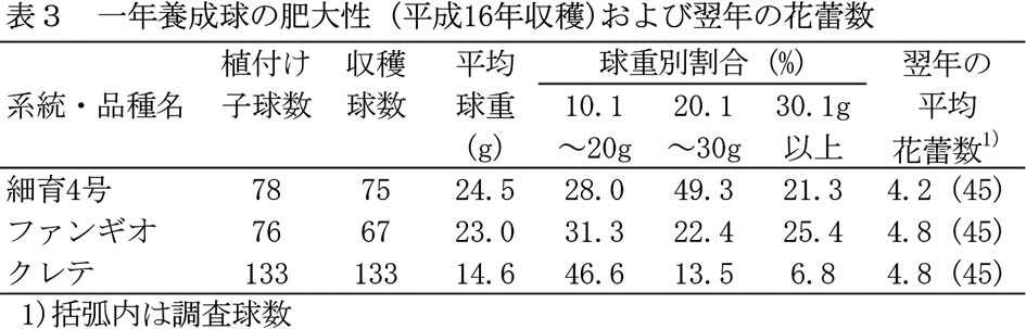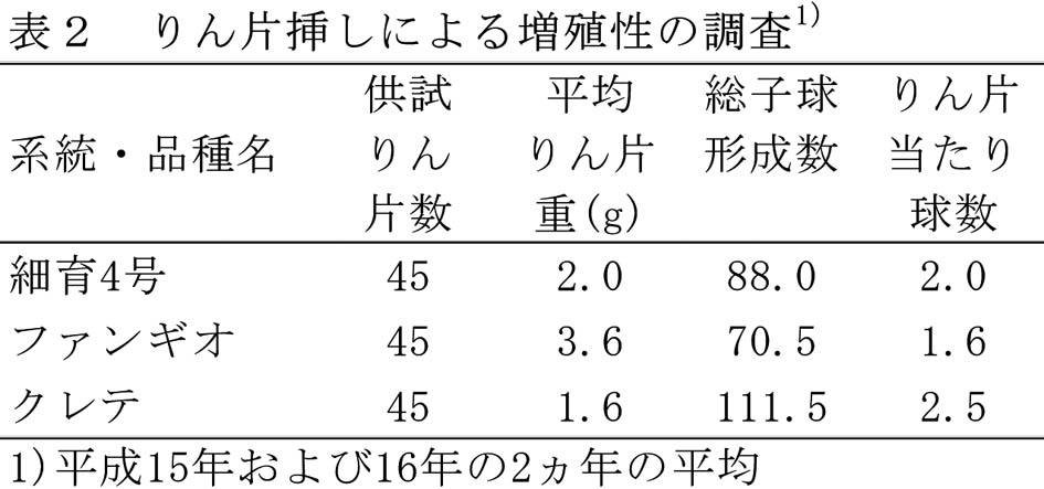 - りん片挿しによる子球形成数は1りん片当たり2.0個であり、増殖性に優れる(表2)。一年養成球の平均球重は24.5gで、10gを超える割合が98.6%と高く、また翌年の花蕾数が4.2個と多く(表3)、一年養成球の多くを切花栽培に利用できる。