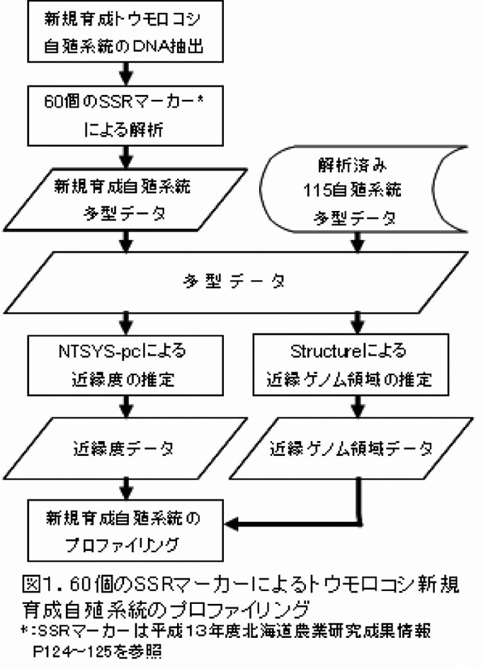 そこで、プロファイリング(大量のデータをデータベース化し対象物の特徴づけを行う)の考え方を応用し、染色体上に偏りなく分布する60個のSSRマーカーによる多型情報をデータベース化して、自殖系統間の近縁関係を推定することにより、各系統の特徴づけを行う。また、このプロファイリングにより推定した系統間の近縁度と収量関連形質の特定組合せ能力との関係を解析し、雑種強勢が強く発現するF1組合せの選抜法を開発する。