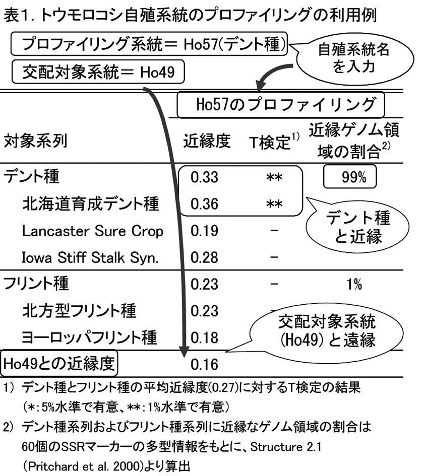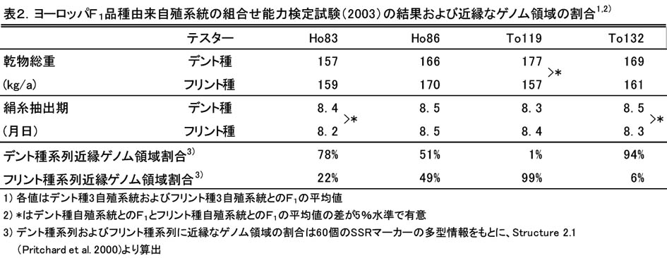 - このプロファイリングでは、各自殖系統について、デント種系列とフリント種系列のそれぞれと近縁なゲノム領域の割合を推定でき、デント種×フリント種のヨーロッパF1品種に由来する自殖系統の系列分けが行える。この系列分けの結果は、寒地向けのデント種系列とフリント種系列のF1組合せでは、雑種強勢がより強く発現し乾物総重が高くなる(To119)、絹糸抽出期が早くなる(Ho83およびTo132)特徴とよく一致する(表2)。