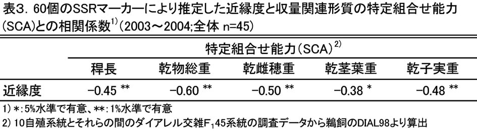 - このプロファイリングで推定された近縁度は、各種収量関連形質の特定組合せ能力と有意な相関(r=-0.38〜0.60)を示し(表3)雑種強勢が強く発現するF1組合せを選定するための有用な情報となる。