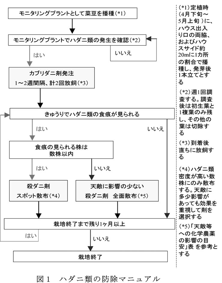 - 菜豆を用いたモニタリングプラント法を目安としてカブリダニ剤(チリカブリダニ、ミヤコカブリダニ)ヲ導入する方法は、ハダニ類防除に有効である。ハダニ類が増殖した場合、食痕の見られる株が数株で1〜2カ所程度であれば殺ダニ剤をスポット散布し、それ以上であれば天敵に影響の少ない殺ダニ剤を全面散布する。