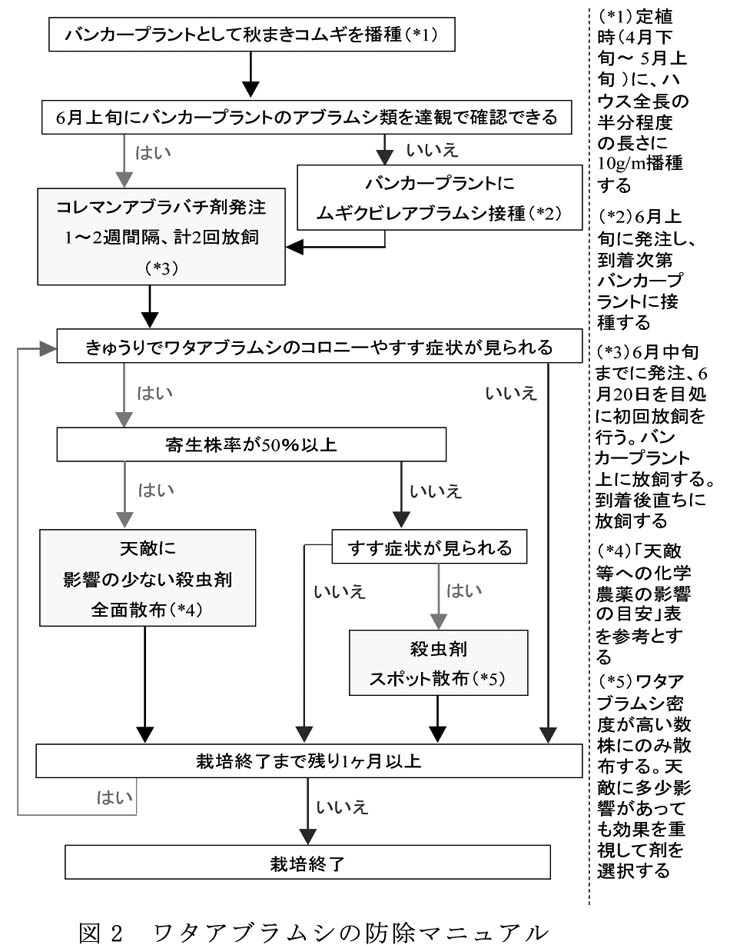 - バンカープラントを設置してコレマンアブラバチ剤を導入する方法は、ワタアブラムシ防除に有効である。バンカープラントで6月中旬までにアブラムシ類を発生させ、ワタアブラムシ初発の可能性がある6月下旬以前にアブラバチ剤の初回放飼を行う。