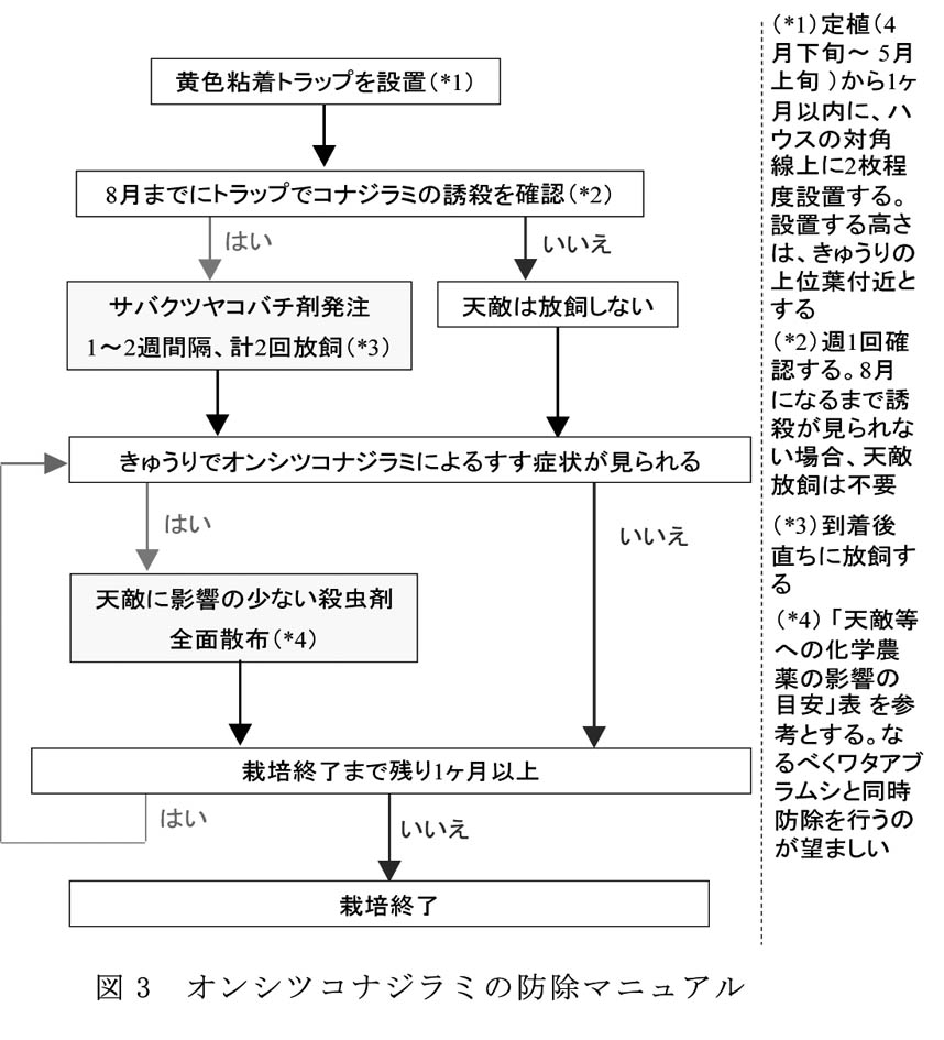 - 以上の内容をとりまとめた、きゅうりの生物農薬利用マニュアルを図1〜4に示す。