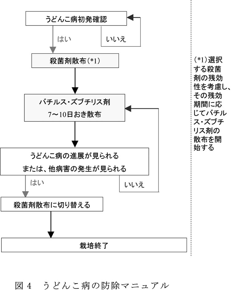 - うどんこ病に対し、発病初期からのバチルス・ズブチリス水和剤(QTS-713株)の継続散布は効果が高い。本剤を効率的に使用するには、発病初期に化学農薬で防除を行ったのちに本剤の散布を開始し、その後うどんこ病の進展が見られ十分な効果が期待できなくなった場合には化学農薬を用いた防除に移行する。