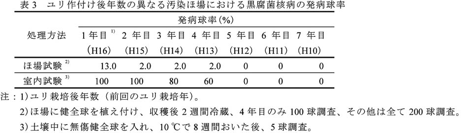 食用ユリの黒腐症状は、Sclerotium cepivorum var. tulipae Desm.によるユリ類黒腐菌核病で、健全種球の使用と長期間ユリの植え付けを行わないことで被害を回避できる。
