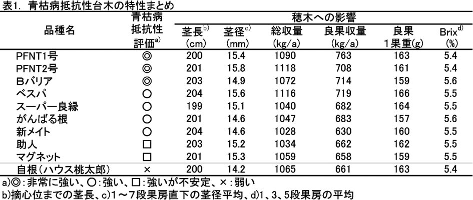 - 青枯病抵抗性台木は他の病害抵抗性や穂木品種との親和性などを確認して使用する。