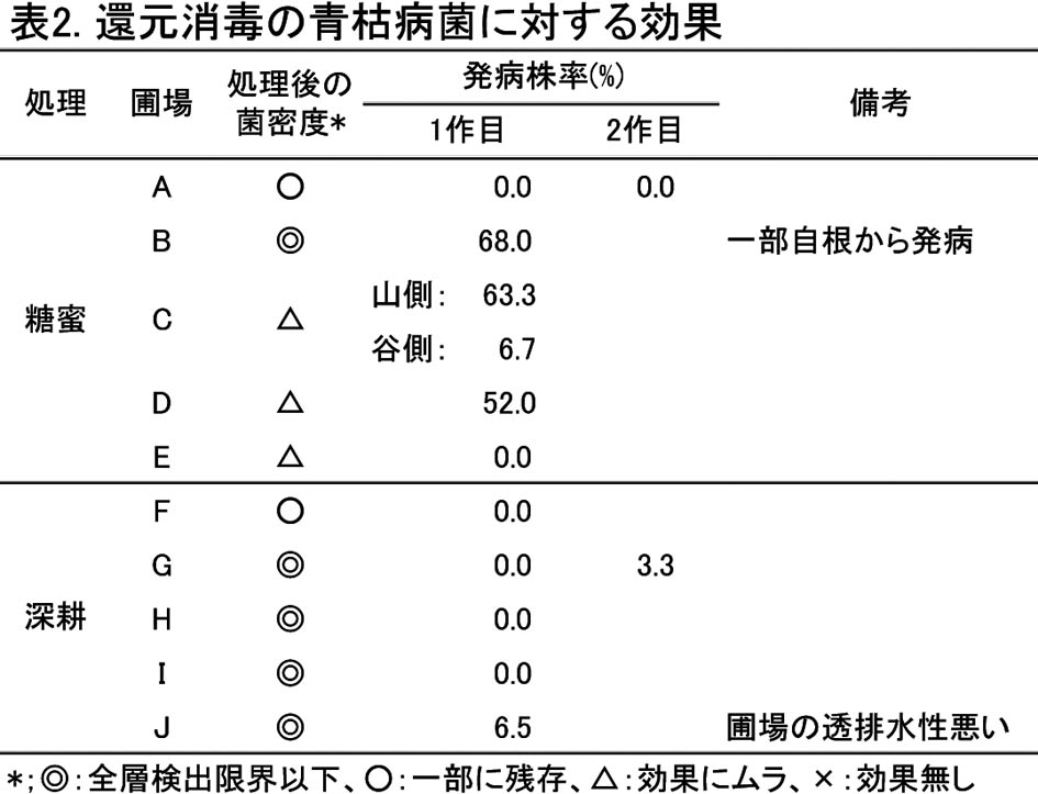 - 青枯病対策の土壌消毒法のうち、太陽熱消毒では青枯病菌の菌量低下が認められず、糖蜜還元消毒では菌量の低下はみられたが圃場内でムラがあり、防除効果も不安定である。一方、米糠を2t/10a投下し深耕ロータリで混和する深耕還元消毒は、40cm深まで青枯病菌菌量を検出限界以下に低下させ(表2)、抵抗性台木と組み合わせることにより防除効果も安定する。また、この組み合わせによる発病抑制効果は、1作目の発病が認められなければ2作期間持続する。ただし、透排水性不良の圃場では深耕還元消毒を行っても十分な防除効果が得られない場合がある。