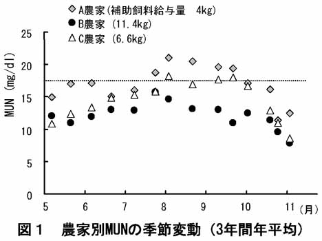 - 幕別町忠類の放牧依存度(摂取飼料に占める放牧草の乾物割合)の異なる放牧農家3軒(A農家;放牧依存度70%、B農家;44%、C農家;66%)において、2003-2005年の5月上旬〜11月上旬にメドウフェスク草地に集約放牧した牛群のMUN含量は、いずれの農家も8-9月にピークがあり、放牧依存度の高い(補助飼料給与量の少ない)農家では、7月中旬〜9月中旬にかけてMUN含量の基準上限値とされる17.5mg/dl以上となる(図1)。