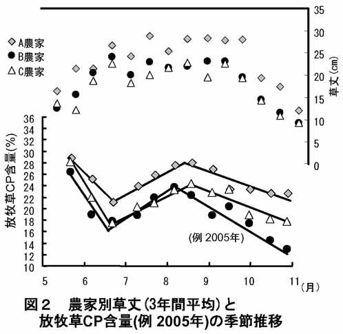 - 各農家の草地における放牧草(n=96)の草丈は、6月上旬〜9月上旬においては20-30cm(年間平均草丈;約20cm、範囲;9.2-31.1cm)に維持されている(図2上)。このような短草利用条件では、CP含量は2つの屈折点(6-7月および8-9月)を持つ季節変動を示す(図2下)が、屈折点におけるCP含量は農家によって異なる。