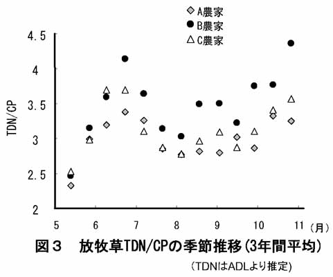 - 放牧草のTDN/CPの季節推移は、各農家とも5月および8-9月に低くなる傾向にあり(図3)、放牧依存度の高いAおよびC農家における放牧草TDN/CPとMUN含量とは、負の相関がある(図4(a)、A,C農家;r=0.43,