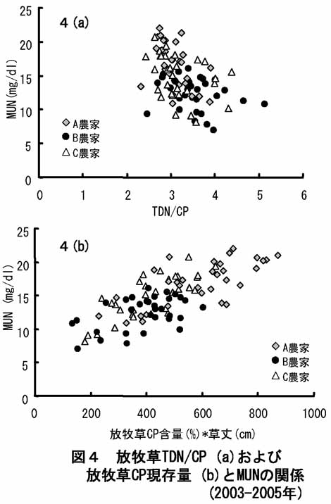 - 草丈を草量の指標として用い、放牧草のCP現存量を表す「放牧草のCP含量(%)×草丈(cm)」は、放牧依存度の高いAおよびC農家の牛群のMUN含量と有意な正の相関がある(図4(b)、A,C農家;r=0.76,