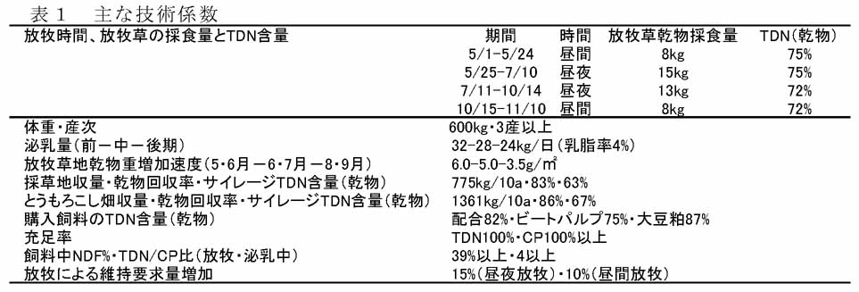 - 主な技術係数を表1に示す。放牧草乾物採食量は放牧時期により異なるとして、泌乳期にCSを最大限給与する場合の飼料構成と所要圃場面積を分娩月別に求める。ただし、乾物摂取量は日本飼養標準に示される範囲内とし、グラスサイレージの給与は乾乳期およびCSのみでは粗蛋白質が不足する時期に限定する。採草専用地と、とうもろこし畑の収量・乾物回収率は北海道農業生産技術体系第3版による。