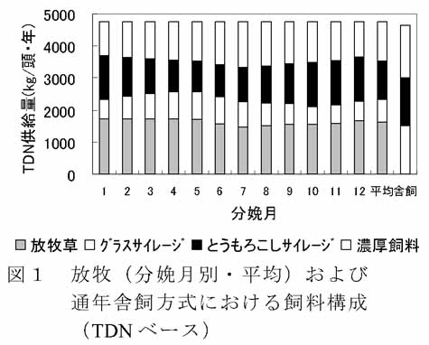 - 年間の可消化養分総量(TDN)ベースでの飼料構成図1に示す。分娩月により乳期と放牧時期との対応関係が変わるため、放牧依存度は31%(7月;以降分娩月を示す)〜36%(1月)と変動する。粗飼料依存度は通年舎飼方式の65%に対し、放牧方式では70%(7月)〜78%(1月)と高い。6-11月分娩は泌乳期間中に占める放牧期間の割合が50%未満となり、放牧依存度が相対的に低下する。