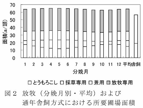 - 1頭当たり所要圃場面積を図2に示す。通年舎飼方式の56aに対し、相対的に粗飼料依存度が高い放牧方式では、63a(10月)〜65a(5月)と大きくなる。放牧草採食量を時期毎に一定値(表1)とすることから、分娩月による放牧地面積の変化はない。分娩月により放牧依存度が変化してCSの利用可能量が異なるため、CS用圃場面積は11月分娩で相対的に多く、5月分娩では少ない。