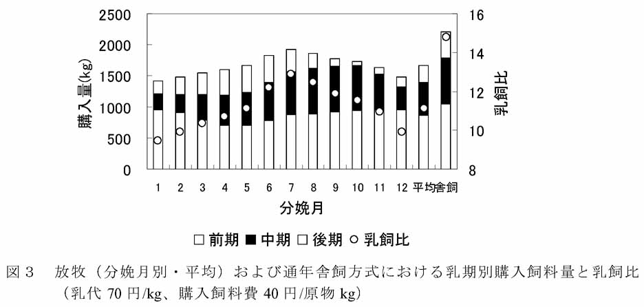 - 1頭当たり購入飼料量(原物kg)と乳飼比を図3に示す。放牧方式での購入飼料量は、1400kg(1月)〜1900kg(7月)となり、6-10月分娩は1700kg以上、12-2月分娩は1500kg以下であるが、通年舎飼方式では2200kgである。乳飼比は、通年舎飼方式の14.8に対し、放牧方式では9.5(1月)〜12.9(7月)と低い。6-8月分娩に比べて、12-2月分娩では放牧導入による乳飼比の低下と飼料自給率向上が一層促進される。