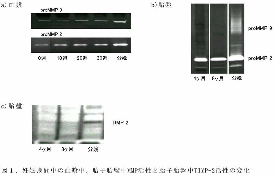 - ゼラチンザイモグラフィーを用いてマトリックスメタロプロテアーゼ及びTIMP-2活性の測定を行ったところ、血漿中のproMMP-2、proMMP-9は妊娠週齢とともに増加し、分娩時に最高値になる。胎子胎盤中proMMP-2も同じ傾向を示すが、proMMP-9とTIMP-2は分娩時にのみ観察される(図1)。