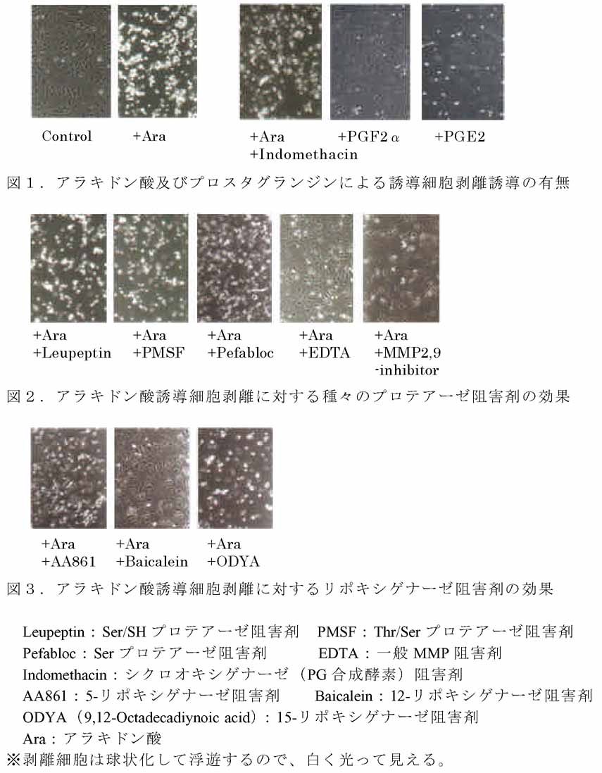 - アラキドン酸による細胞剥離はEDTA(一般MMP阻害剤)添加で阻止され、またマトリックスメタロプロテアーゼ2,9阻害剤(MMP-2,9