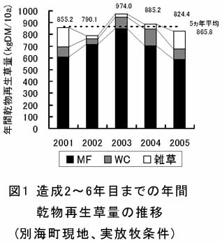 - MF「ハルサカエ」主体草地の年間乾物再生草量は平均865.8kgDM/10aで、土壌凍結地帯で利用上問題のない、高い永続性を有する(図1)。