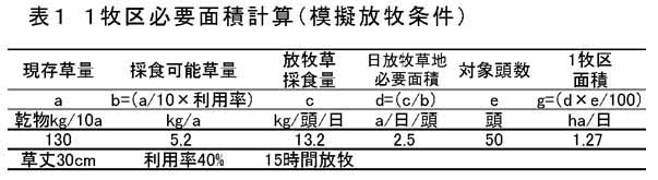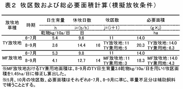 - MFおよびTY草地の季節生産性を明らかにした。泌乳牛50頭の放牧飼養に必要な面積は、MF主体放牧地では6-7月に14ha、8-9月に18.3ha(内4.3ha兼用地)、TY放牧地では6-7月に14ha、8-9月に20.3ha(内6.3ha兼用地)が必要で、MF主体放牧地を用いるとTY主体放牧地に比べ8月以降の放牧地面積を2ha少なくすることができる(表1、表2)。